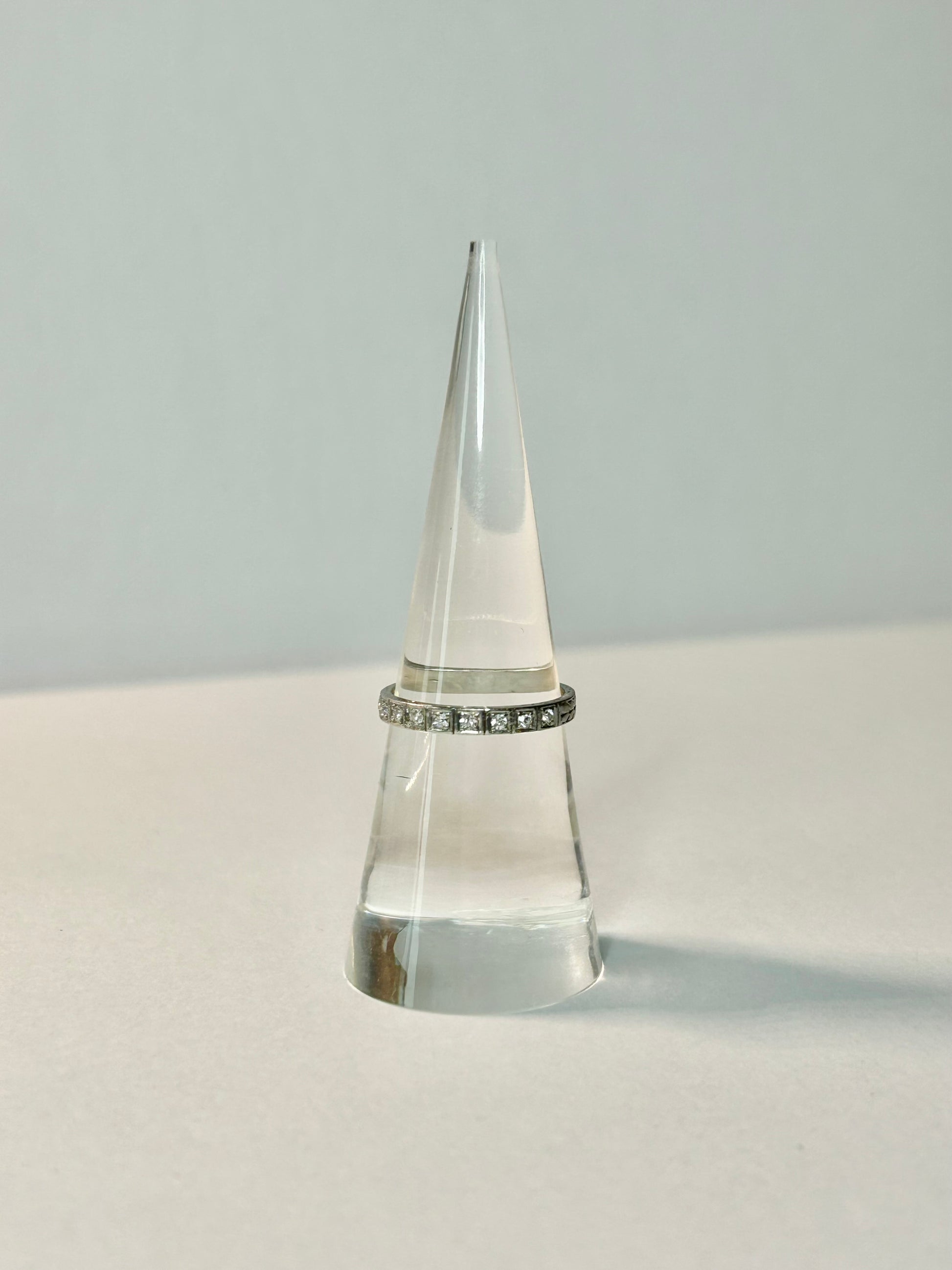 A beautiful antique band with single cut diamonds and floral etching. These are so fun to collect and add into your stack in so many ways. I do not recommend sizing this one, as the etching goes all the way around, and it has made it this far!