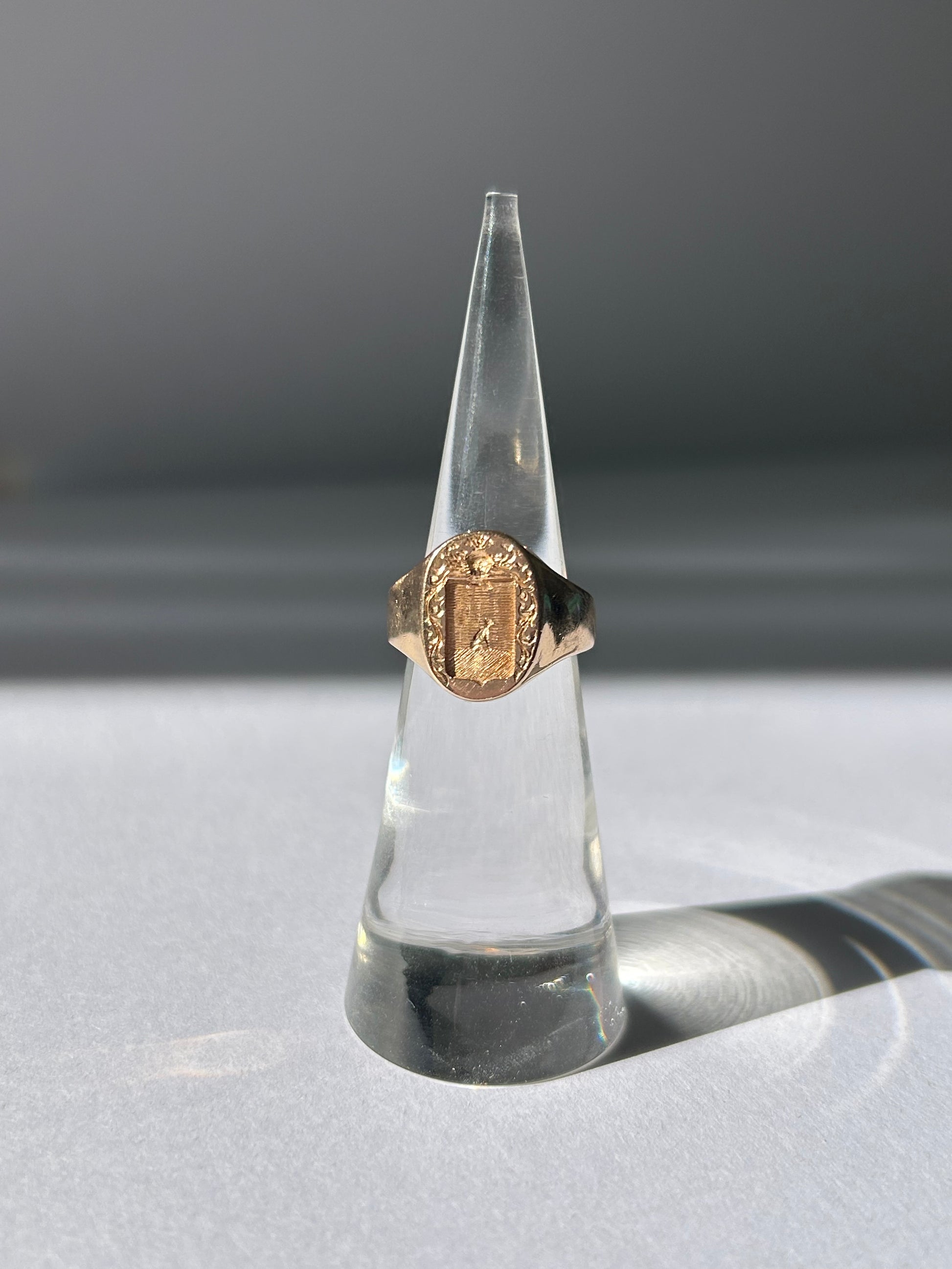 I have been hoarding this ring and debating on whether or not I should keep it. I reeeeally want to keep it but alas, it was sourced to sell. Here we have a signet of a dog sitting in a field like a good boy, with a knight's helm at the top and framed with scrolling ivy. Very seldomly do you see a signet this special. Like a unicorn signet except not a unicorn. Not to mention, there is a second engraving of a casual swan carved on the underside. No biggie.
